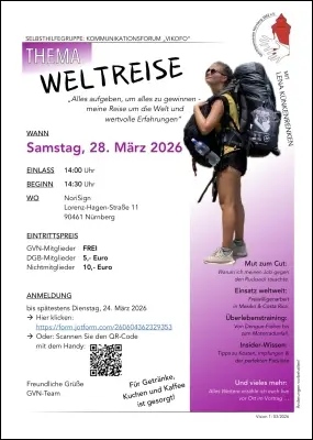 Am Samstag, 28. März 2026, lädt die Selbsthilfegruppe Kommunikationsforum „VIKOFO“ zu einem spannenden und inspirierenden Vortrag nach Nürnberg ein. Unter dem Thema „Weltreise – Alles aufgeben, um alles zu gewinnen“ berichtet Lena Künkenrenken von ihrer Reise um die Welt und von den wertvollen Erfahrungen, die sie dabei gesammelt hat.